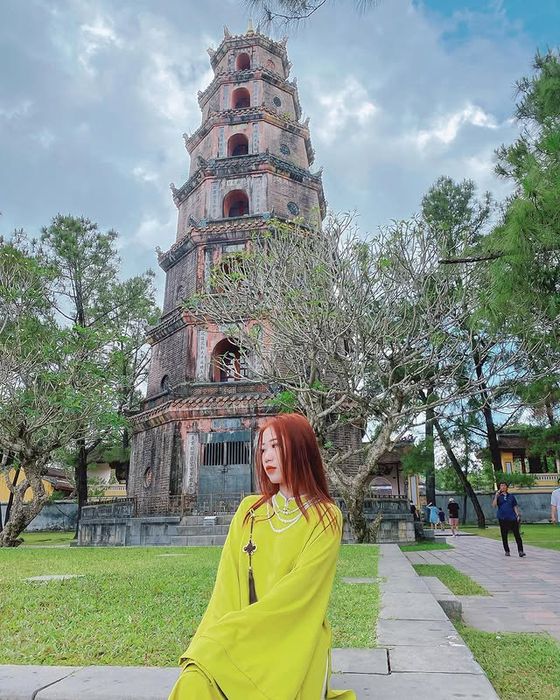 Chùa Thiên Mụ, hay còn gọi là Linh Mụ, là ngôi chùa cổ kính và nổi tiếng bậc nhất ở Huế. Chùa tọa lạc trên đồi Hà Khê, bên bờ sông Hương thơ mộng. Được xây dựng từ năm 1601 dưới triều đại của chúa Nguyễn Hoàng, chùa Thiên Mụ gắn liền với nhiều truyền thuyết và những dấu ấn lịch sử của vùng đất cố đô. Tháp Phước Duyên cao 7 tầng là biểu tượng đặc trưng của chùa. Bên cạnh đó, còn có các công trình cổ kính như Điện Đại Hùng, Điện Địa Tạng, Điện Quan Âm... Chùa Thiên Mụ là điểm check-in phổ biến với những người yêu thích cổ phục ở Huế.