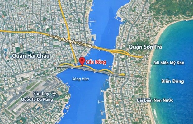 Vị trí của Cầu Rồng trên bản đồ Đà Nẵng nằm giữa trung tâm thành phố và bãi biển phía Đông.