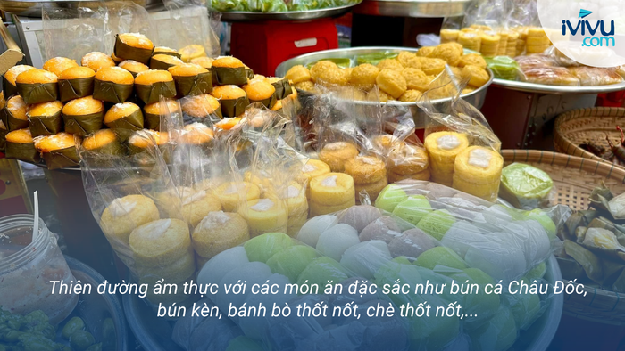 Không dừng lại ở mắm, chợ Châu Đốc còn là điểm hẹn của những món ngon đặc sản. Dạo bước trong chợ, thực khách sẽ bị quyến rũ bởi hương thơm của vô số món ăn đậm chất Nam Bộ. Đừng quên thử ngay tô bún cá Châu Đốc nóng hổi đúng điệu, bún kèn độc đáo, chè thốt nốt thanh mát hay bánh bò thốt nốt thơm ngon. Những món ăn giản dị nhưng đậm đà bản sắc miền Tây này chắc chắn sẽ làm xiêu lòng bất kỳ ai.