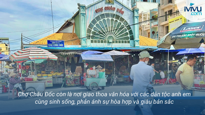 Chợ Châu Đốc không đơn thuần là nơi buôn bán mà còn là điểm giao thoa văn hóa của nhiều dân tộc anh em như Kinh, Khmer, Chăm, Hoa,... Quanh khu vực chợ và thành phố Châu Đốc có nhiều công trình tín ngưỡng đa dạng: chùa Khmer, miếu Bà Chúa Xứ, đền người Hoa, thánh đường Hồi giáo Chăm. Tất cả tạo nên bức tranh văn hóa đa sắc màu, thể hiện rõ nét sự giao thoa hài hòa và giàu bản sắc của vùng đất Bảy Núi.