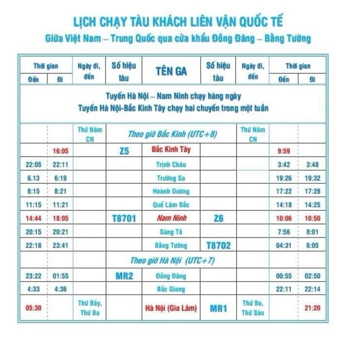 📌 Lưu ý: Tuyến tàu Hà Nội – Nam Ninh chạy hàng ngày, trong khi tuyến Hà Nội – Bắc Kinh chỉ có lịch chạy cố định vào thứ Ba và thứ Sáu.