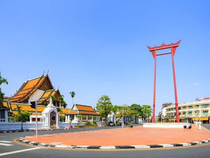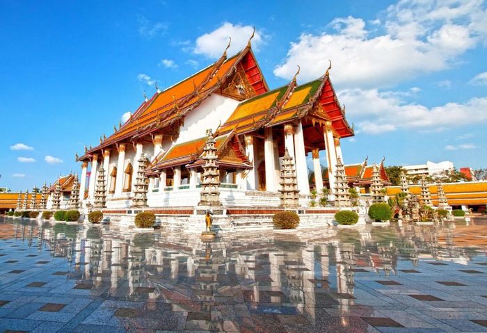 Wat Suthat gây ấn tượng với bức tượng Phật bằng đồng lớn và chiếc khung gỗ đỏ đồ sộ (Giant Swing) đặt phía trước sân đền. Địa điểm này trước kia từng là nơi cử hành các nghi thức quan trọng của hoàng tộc. Với lối kiến trúc tinh xảo và bầu không khí tĩnh lặng, Wat Suthat luôn là điểm đến được nhiều du khách ưa chuộng.