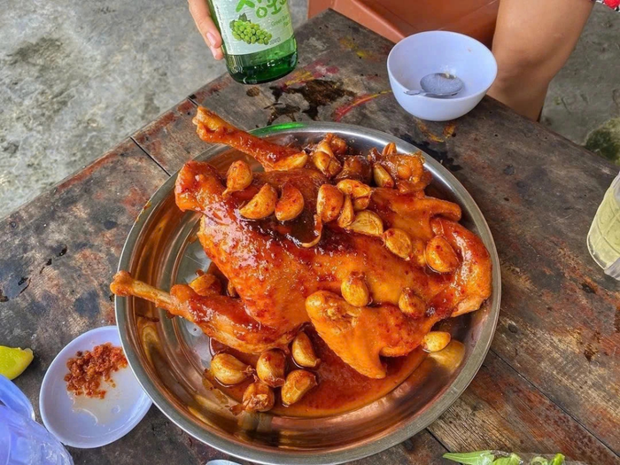 Gà hấp tỏi là món ăn thay đổi khẩu vị lý tưởng bên cạnh các món hải sản. Gà ta nuôi thả tự nhiên được hấp cùng tỏi nguyên củ. Thịt gà săn chắc, ít mỡ, thấm đẫm gia vị, thường ăn kèm với muối tiêu chanh hoặc muối ớt xanh.