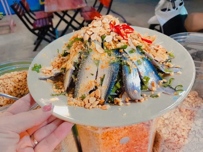 Gỏi cá trích nổi bật với vị tươi ngọt của cá kết hợp với sự béo ngậy của dừa nạo. Cá được làm sạch, thái lát mỏng, trộn với chanh hoặc giấm để cá tái nhẹ, sau đó ăn kèm rau sống và bánh tráng. Nước chấm mắm cá pha chua ngọt chính là điểm đặc biệt của món ăn này.