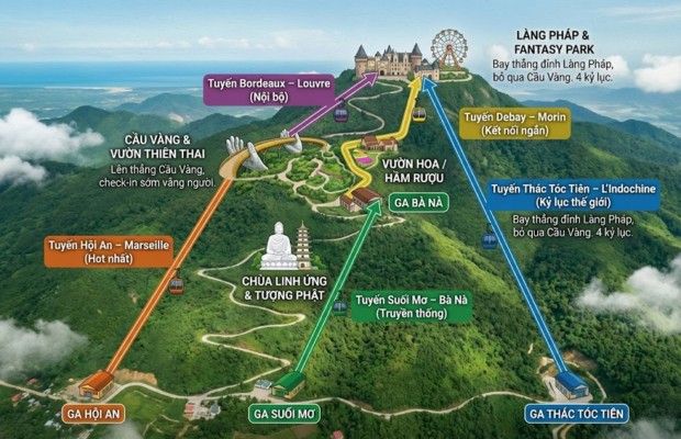 Tuyến Hội An – Marseille (Tuyến hot nhất): Dẫn du khách từ chân núi thẳng lên khu vực Cầu Vàng và Vườn Thiên Thai. Nếu bạn muốn check-in Cầu Vàng khi vắng người, đừng bỏ qua tuyến này ngay khi đến.