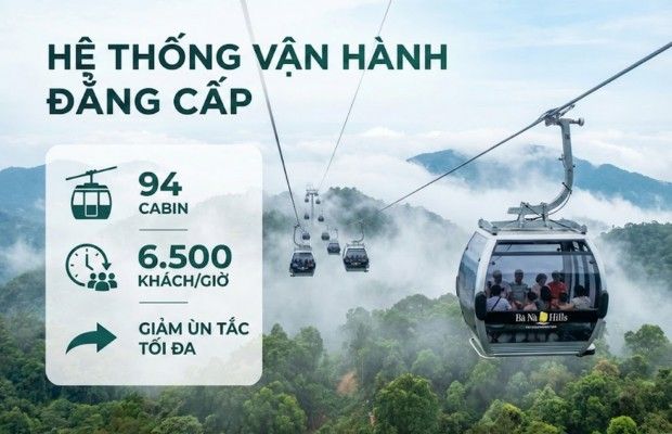 Với 94 cabin hiện đại, hệ thống cáp treo Bà Nà Hills có thể phục vụ lên đến 6.500 khách mỗi giờ. Nhờ vào công suất lớn này, tình trạng ùn tắc được giảm thiểu tối đa, ngay cả trong những ngày lễ tết cao điểm, mang đến trải nghiệm tour du lịch Đà Nẵng trọn gói vô cùng suôn sẻ cho du khách.
