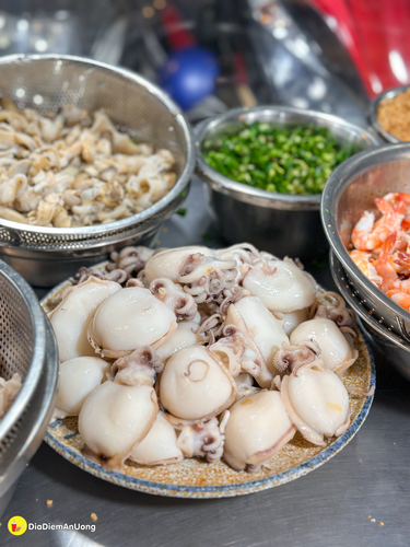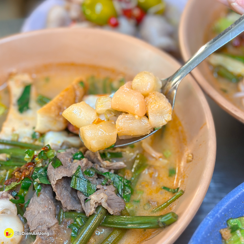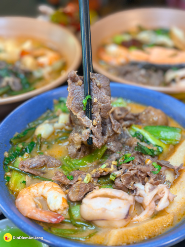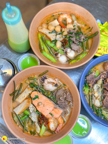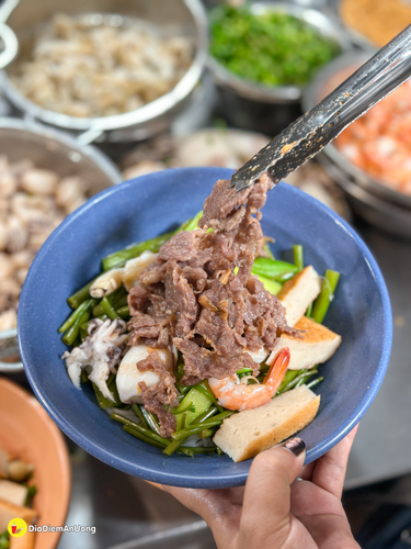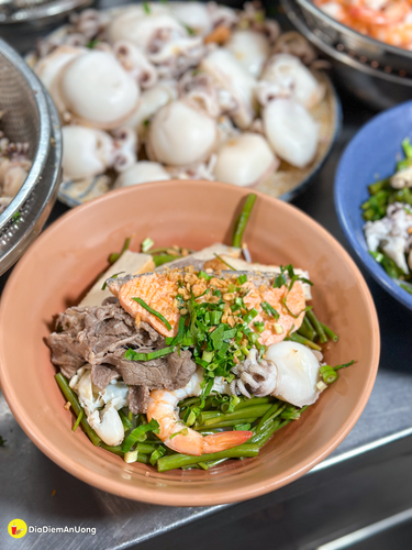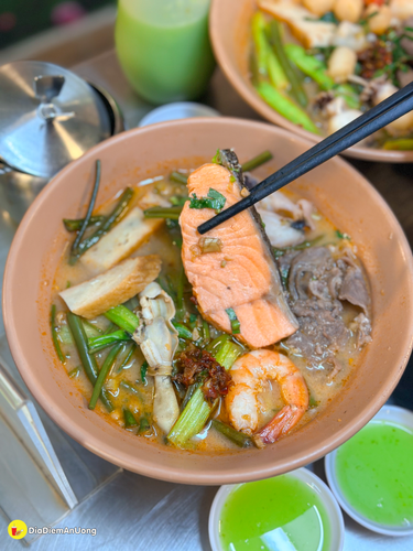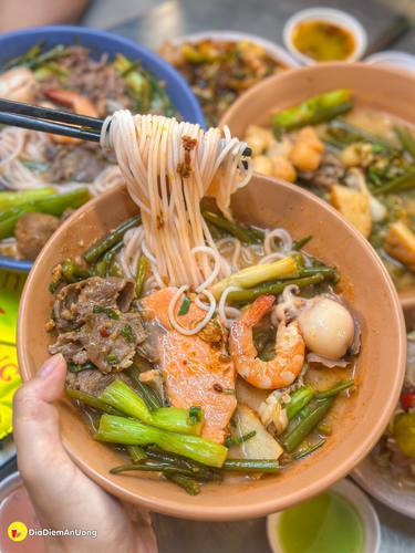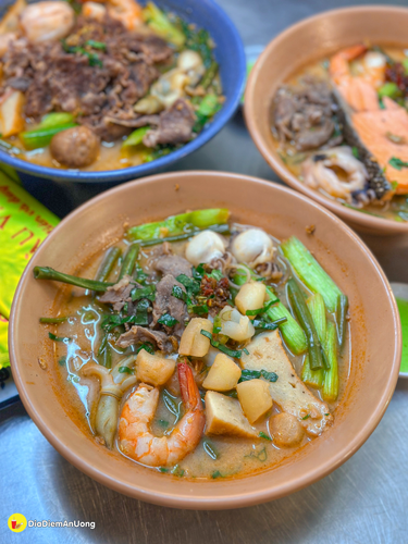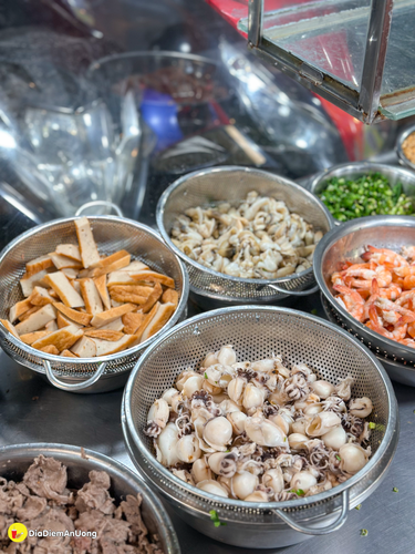 Topping tại đây vô cùng phong phú: từ thịt bò, cá hồi, tôm, mực, ốc móng tay, chả cá, đến sò điệp, ăn kèm với rau muống và kèo nèo. Mọi món đều tươi ngon, quầy đồ ăn luôn sạch sẽ và ngăn nắp.