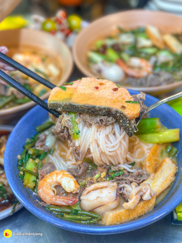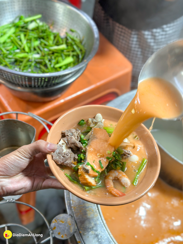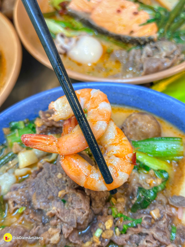 Tô bún nổi bật với sắc cam đỏ của nước lèo và tôm thẻ, cộng với màu xanh mướt của rau muống khiến món ăn trông thật hấp dẫn.