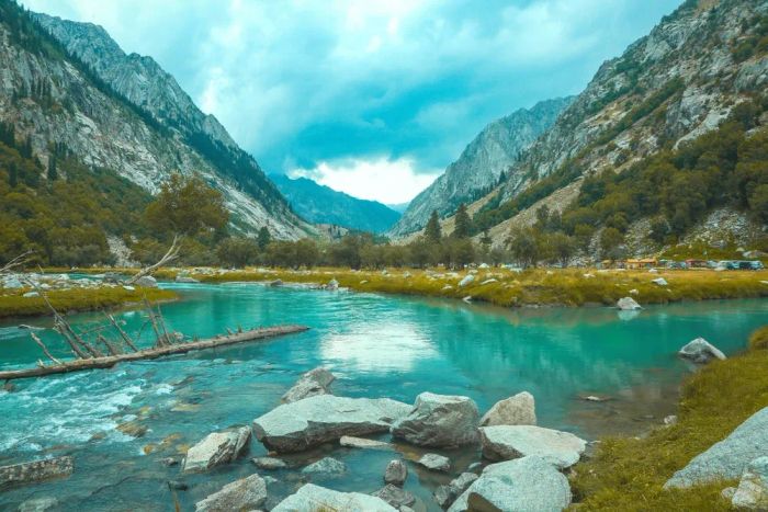 Sau khi rời khỏi đỉnh núi, hành trình tiếp tục dẫn bạn đến Thung Lũng Lam Nguyệt – nơi một dòng sông xanh biếc uốn lượn dưới chân núi. Nước sông trong vắt, bắt nguồn từ băng tuyết tan, phản chiếu cảnh vật thiên nhiên như một tấm gương lớn. Thung lũng có bốn hồ chính: Hồ Rượu Ngọc, Hồ Gương, Hồ Lam Nguyệt và Hồ Nghe Sóng.