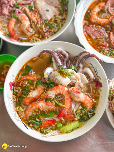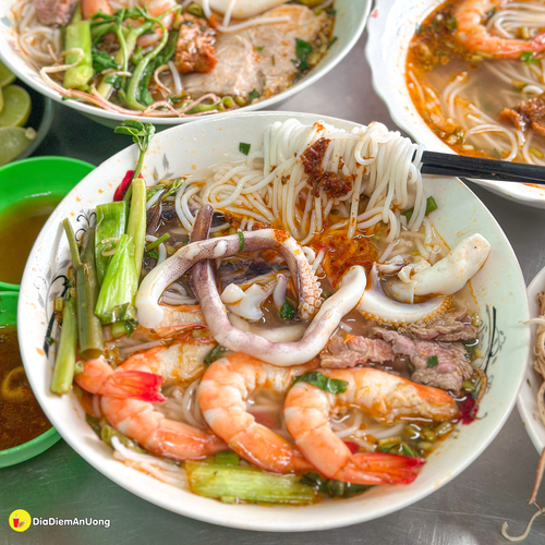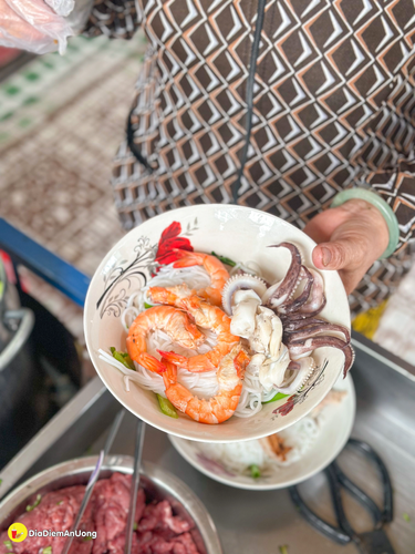 Một tô đầy đủ bao gồm: tôm, bò tái, mực, chả, thịt nạc và cá viên. Ăn ở chị Tiên thì cứ thoải mái gọi bún nhiều, chị bán rất dễ thương và nhiệt tình lắm!