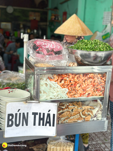 Hôm mình ghé là thứ 5 – ngày bán Bún Thái, mà ấn tượng nhất với mình là tủ đồ ăn đầy ắp, tôm, mực, chả đủ loại. Nước lèo cũng hấp dẫn vô cùng, vàng óng ánh, dậy mùi sả thơm lừng, nhìn thôi đã muốn ăn ngay.