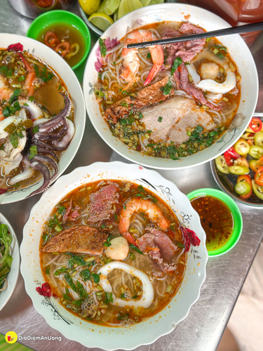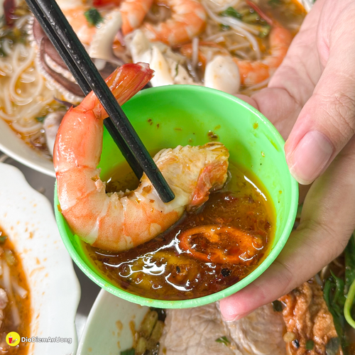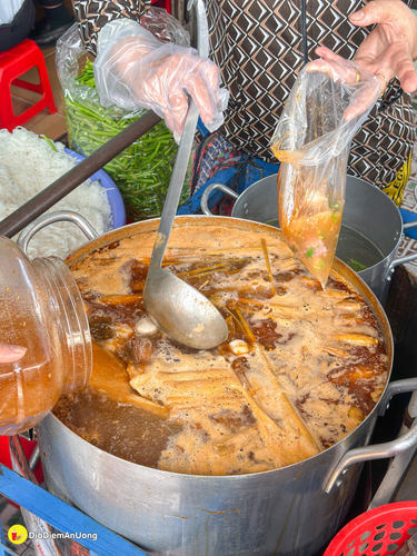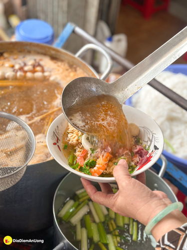 Nước lèo có vị chua ngọt hài hòa, không quá đậm đà nên rất dễ ăn. Nếu bạn thích vị đậm đà hơn thì thêm chút nước mắm là ngon tuyệt. Một tô đầy đủ thế này, ăn là no căng luôn.