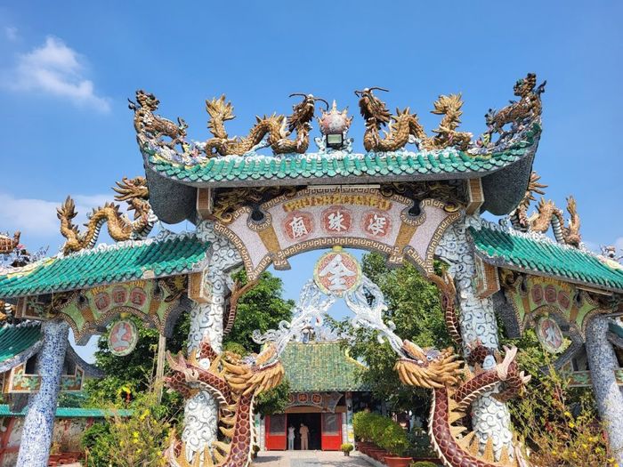 Ngay từ cổng tam quan, Phù Châu Miếu đã thu hút ánh nhìn với lối kiến trúc dân gian truyền thống đầy màu sắc. Mái ngói âm dương cong mềm, các mảng phù điêu rồng phượng khảm gốm sứ tinh tế, rực lên dưới ánh nắng.