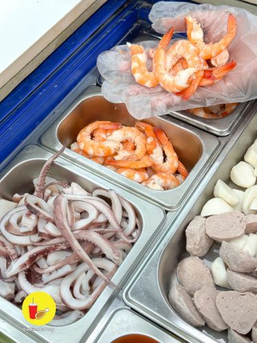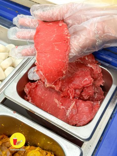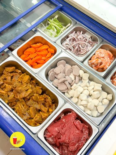 Không gian quán mở, mình ấn tượng ngay với tủ topping đầy ắp. Các loại thịt được bảo quản trong tủ mát, giữ được độ tươi ngon và vệ sinh cho món ăn.