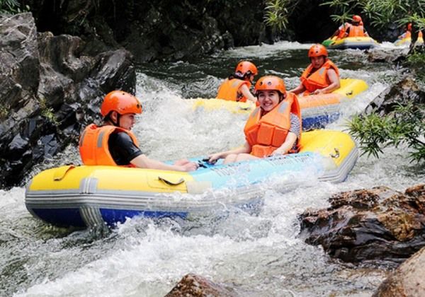 Nếu bạn đam mê những cảm giác mạnh, Hòa Phú Thành là điểm đến không thể thiếu trong hành trình du lịch gần Đà Nẵng. Nổi bật tại đây là trải nghiệm trượt thác dài 3km bằng xuồng cao su qua các ghềnh đá lớn nhỏ. Ngoài ra, bạn còn có thể thử sức với Zipline, tham gia các trò chơi dân gian, hoặc thư giãn tắm suối tự nhiên giữa không gian xanh mát của núi rừng.
