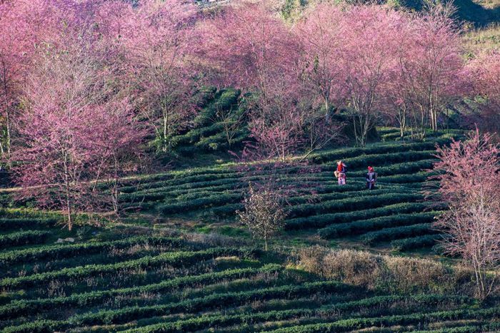 Miền sơn cước mê hoặc du khách bởi vẻ đẹp vừa hoang sơ, vừa tinh tế. Hoa mai anh đào nở rực rỡ khắp các đồi núi, tô điểm bình minh bằng sắc hồng và nhuộm vàng những chiều hoàng hôn. Những bông hoa nhỏ nhắn như những đốm lửa ấm áp, sưởi ấm cả mùa đông trên cao nguyên.