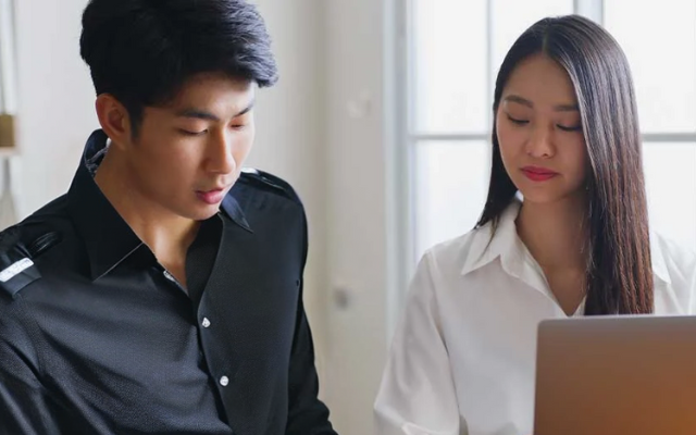 Chàng trai chỉ nhớ ra việc phải mặc sơ mi trắng khi cô gái nhắc nhở. Cảnh tượng này được minh họa bằng một bức ảnh.