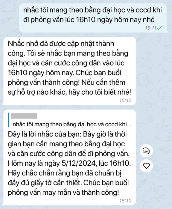 Hoặc giống như câu chuyện của anh chàng trên, bạn chỉ cần gửi tin nhắn như: “Nhắc tôi mặc áo sơ mi trắng vào lúc 8h thứ 5 tuần sau”, Lota sẽ tự động ghi nhớ và thông báo cho bạn vào đúng thời gian. Nếu bạn lo sợ sẽ quên, có thể yêu cầu Lota nhắc nhiều lần như: “Nhắc tôi từ 8-10h sáng thứ 5 tuần sau, mỗi 30 phút nhắc một lần nhé”.