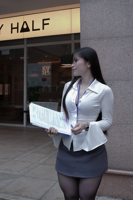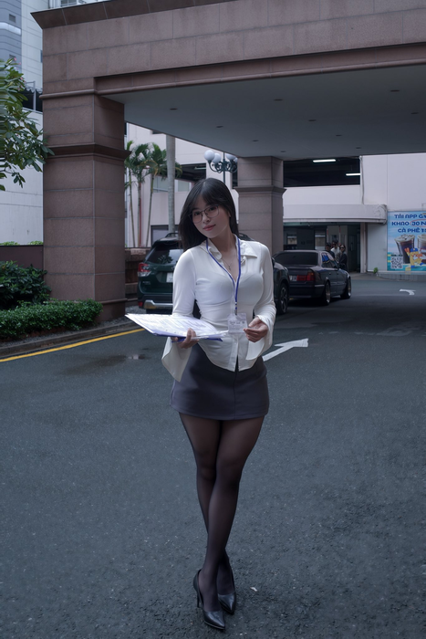 Tuy nhiên, cô nàng đã gây bất ngờ khi hoàn toàn 'lột xác' trong vai trò 'cô thư ký' gợi cảm. Khác xa hình ảnh năng động trong phòng gym, Đ.D xuất hiện với sơ mi trắng ôm sát, chân váy ngắn, tất đen và giày cao gót. Cặp kính gọng tròn không chỉ tôn lên vẻ tri thức mà còn giữ được sự quyến rũ khó cưỡng. Bộ ảnh nhanh chóng trở thành chủ đề bàn tán rôm rả trên các diễn đàn.