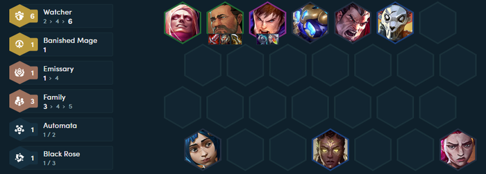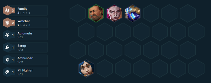 Đội hình khởi đầu người chơi nên xây dựng với mốc 3 Gia ĐìnhGiống như các lối chơi reroll chủ lực 2 tiền khác, người chơi sẽ dừng việc mua kinh nghiệm khi đạt cấp 6 và tìm kiếm Vander. Trong quá trình này, Vladimir sẽ là sự bổ sung rất tốt để kích hoạt mốc 4 Giám Sát, giúp chủ lực của bạn có khả năng chống chịu và trụ giao tranh vững vàng hơn giữa trận. Chỉ số này giúp giảm sát thương từ hệ Giám Sát, kết hợp với trang bị hồi phục mạnh mẽ, sẽ giúp Vander khó bị hạ gục.