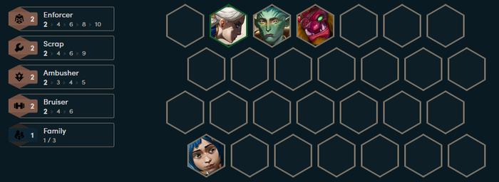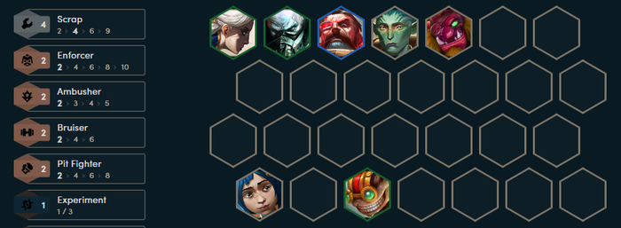 Trong giai đoạn đầu trận, Trundel và Powder đóng vai trò cực kỳ quan trọng để kích hoạt mốc 2 Tái Chế ngay từ sớm. Bên cạnh đó, sự xuất hiện của Steb hay Camille giúp người chơi mở khóa những mốc quan trọng như Đấu Sĩ, Phục Kích và Cảnh Binh. Đội hình này không chỉ đảm bảo sức chống chịu vững vàng ở tuyến trước mà còn mang lại sát thương đầu ra mạnh mẽ, hỗ trợ game thủ trong việc giành chuỗi thắng.