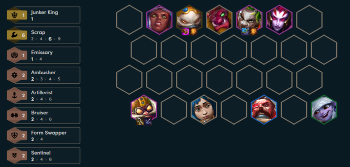 Khi đạt mốc 4 Tái Chế, người chơi sẽ cảm nhận rõ rệt sự khác biệt trong sức mạnh giữa các đội hình ở giữa trận, với lớp khiên dày và khả năng chống chịu mạnh mẽ.Ở giai đoạn cuối trận, người chơi sẽ tập trung lên cấp độ 9 và hoàn thành mốc 6 Tái Chế, bao gồm các tướng như Corki, Ekko hay Rumble. Đồng thời, Elise và Sevika sẽ giúp gia tăng sức chống chịu ở tuyến trước và cung cấp hiệu ứng khống chế cho đội hình. Khi này, người chơi cũng nên thay thế Urgot bằng Tristana để tận dụng hiệu ứng Sứ Giả, giúp đội hình gia tăng sát thương hiệu quả hơn.