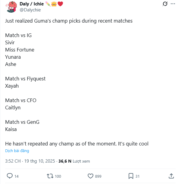 Trong suốt những ngày thi đấu của CKTG 2025, các fan của T1 đã trải qua nhiều cảm xúc khác nhau và chỉ có thể cảm thấy yên tâm khi đối thủ tiếp theo của họ tại nhánh 1-2 chỉ là 100T, đội tuyển không được đánh giá cao như T1. Hơn nữa, T1 sẽ có khoảng 3 ngày để chuẩn bị cho các vòng tiếp theo. Trong hoàn cảnh này, một điểm sáng là Gumayusi, người chưa từng chọn tướng nào quá 2 lần, dù anh là Xạ Thủ tham gia thi đấu nhiều nhất.