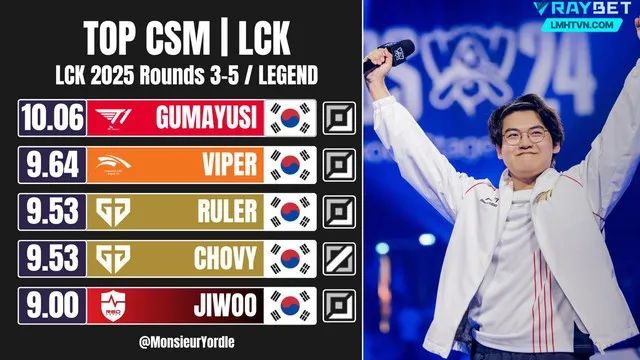 Thống kê mới nhất sau tuần thi đấu thứ 12 cho thấy Gumayusi tiếp tục thống trị hai chỉ số quan trọng: KDA 8.24 và farm 10.06 cs/phút. Khoảng cách về KDA giữa anh và Viper (6.62) - đối thủ từng được đánh giá vượt trội hơn - đã chứng minh sự tiến bộ vượt bậc của Gumayusi