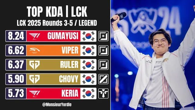 Điểm đáng chú ý khác trong top 5 KDA là sự xuất hiện của Keria - Hỗ Trợ T1, khi anh xếp thứ 5 với KDA 5.73, vượt mặt nhiều Xạ Thủ kỳ cựu LCK. Có thể thấy cặp bot T1 sở hữu lối chơi cực kỳ hung hãn và luôn biết cách tối đa hóa khả năng sát thương từ các tướng được chọn