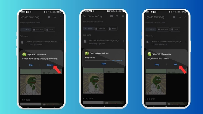 - Mở file cài đặt và cấp quyền từ nguồn không xác định: Vào Quản lý tệp → Tệp đã tải xuống, chọn file .apk vừa tải. Nếu hệ thống báo lỗi cấm cài đặt từ nguồn không rõ, bạn cần vào Cài đặt → cho phép Cài đặt ứng dụng từ nguồn không xác định (hoặc cấp quyền cho trình duyệt/ứng dụng quản lý file đang dùng).