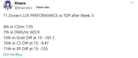 Thực tế, các chỉ số của Doran đang làm fan T1 không thể cảm thấy yên tâm.
