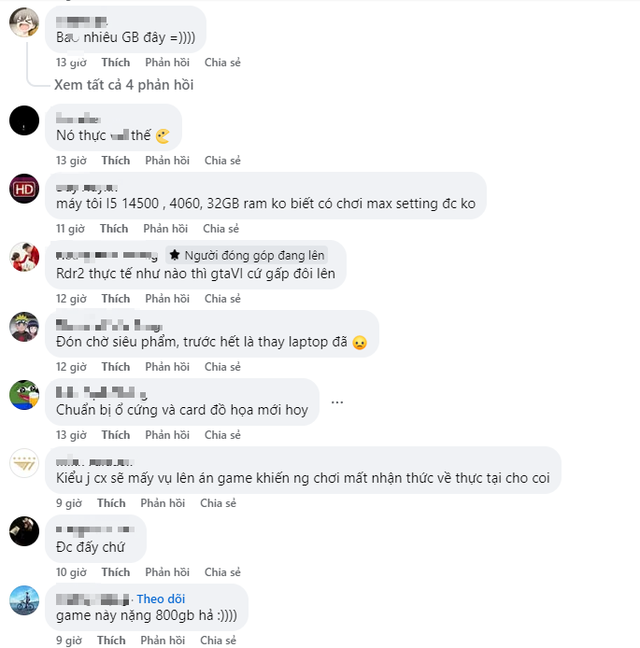 Dưới phần bình luận, cộng đồng game thủ Việt cũng đang sôi nổi thảo luận về vấn đề này. Nhiều người bày tỏ sự nghi ngờ về tính xác thực của thông tin "spoil" đã được chia sẻ. Một số khác thì lo lắng về mức giá của trò chơi. Tuy nhiên, vấn đề khiến các game thủ Việt bận tâm nhất có lẽ là yêu cầu cấu hình phần cứng, khi rất có thể GTA 6 sẽ đòi hỏi họ phải "nâng cấp" dàn máy của mình. Nhưng đó có thể là chuyện của vài năm nữa, khi mà hiện tại, chưa ai biết chính xác khi nào trò chơi này sẽ được ra mắt, huống chi là trên PC.