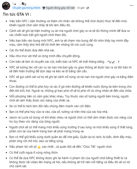 Mới đây, cộng đồng fan GTA 6 lại được dịp tranh luận sôi nổi khi trong một group game Việt bất ngờ xuất hiện một đoạn "spoil" về cơ chế và gameplay của tựa game này.