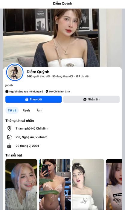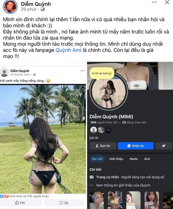 Một tài khoản Facebook giả mạo tên Diễm Quỳnh, với lượng tương tác và theo dõi lớn, liên tục đăng tải hình ảnh đời thường, gợi cảm của cô nàng. Điều đáng chú ý là tài khoản này không chỉ mạo danh mà còn chủ động nhắn tin cho các 'quý ông' để chào mời dịch vụ với mức báo giá lên đến 10 triệu đồng.
