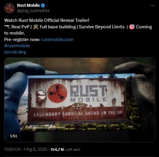 Hiện game thủ đã có thể đăng ký trước Rust Mobile thông qua website chính thức bằng email cá nhân. Dù chưa có ngày phát hành chính thức, nhưng các hoạt động gần đây cho thấy game đang trong giai đoạn hoàn thiện cuối. Đây chắc chắn là tựa game đáng chờ đợi trong năm 2025, đặc biệt với fan của bản PC Rust. Chúng tôi sẽ tiếp tục cập nhật mọi thông tin mới nhất về trò chơi.