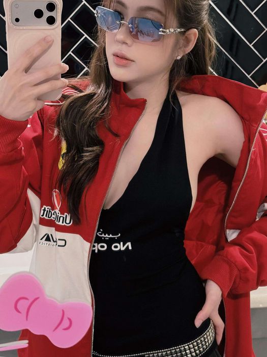 Chiếc áo khoác đỏ trắng nổi bật, đầy mạnh mẽ được khoác ngoài, tạo nên vẻ thu hút tuyệt vời khi kết hợp cùng chiếc áo đen ôm sát, tôn lên đường cong quyến rũ. Đặc biệt, chi tiết cut-out sâu cùng chiếc thắt lưng ánh bạc đã làm tôn thêm sự hiện đại của bộ trang phục này.