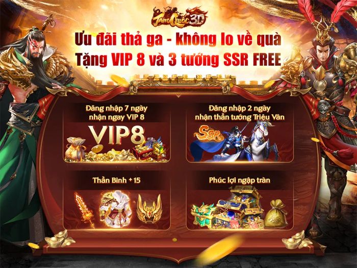 Với ưu đãi chào mừng chưa từng có, chỉ cần chơi 15 phút, bạn sẽ nhận ngay 3 tướng SSR mạnh mẽ. Đăng nhập đủ 2 ngày, nhận ngay Triệu Vân thần tướng và combo VIP cực kỳ giá trị: