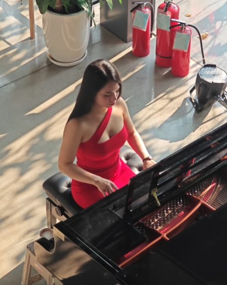 Cô gái chơi piano đầy quyến rũ này hiện đang ẩn danh, được tài khoản Pianovu** thường xuyên đăng tải lên mạng xã hội. Theo đồn đoán, cô thường biểu diễn trong khuôn viên của một công ty không tiết lộ tên. Điểm đáng chú ý là cô luôn chọn những bộ trang phục gợi cảm, khoe body nóng bỏng để tạo nên những màn trình diễn vừa đẹp mắt vừa lôi cuốn.