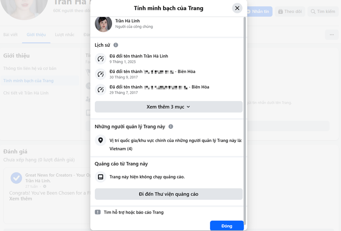 Tuy nhiên, sau khi kiểm tra, hóa ra đây chỉ là một fanpage giả mạo. Fanpage này có hơn 60.000 lượt thích và thường xuyên đăng tải ảnh, video của Hà Linh để câu view và tương tác. Điều đáng chú ý là trong phần liên hệ công việc, fanpage này lại dẫn tới một tài khoản Telegram đáng ngờ. Ngoài ra, trong mục tính minh bạch của trang, có thể thấy chủ sở hữu đã đổi tên từ một fanpage cũ sang tên mới như hiện tại.