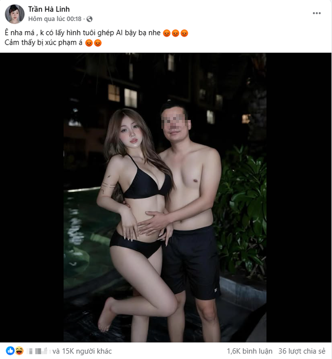 Dẫu vậy, dường như thị phi vẫn chưa buông tha cô. Mới đây, cộng đồng mạng lại được phen xôn xao khi xuất hiện một tài khoản Facebook mang tên Trần Hà Linh, đăng tải hình ảnh một cô gái mặc bikini chụp cùng nam giới, kèm theo dòng trạng thái đầy bức xúc: 'Ê nha má, không có lấy hình tuổi ghép AI bậy bạ nhé. Cảm thấy bị xúc phạm á!'. Bài viết nhanh chóng thu hút hàng chục nghìn lượt tương tác, khiến nhiều người tưởng rằng chính Hà Linh là người đăng tải.