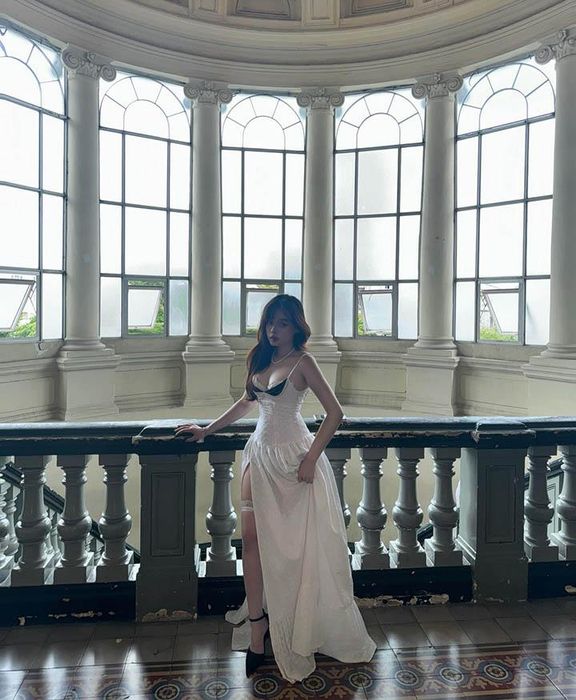 Phong cách thời trang của Nguyễn Quỳnh Anh là sự hòa quyện giữa nét cổ điển, lãng mạn và hiện đại, thể hiện khả năng biến hóa đa dạng. Trong bộ ảnh 'lọ lem' gây bão, cô nàng chọn chiếc váy dài trắng tinh khôi, với thiết kế hai dây mảnh mai và chi tiết ren tinh xảo, đường xẻ tà cao, tạo nên hình ảnh một nàng công chúa bước ra từ câu chuyện cổ tích nhưng lại mang đậm dấu ấn hiện đại. Điểm nhấn là chuỗi ngọc trai quý phái, phụ kiện hoàn hảo làm tôn lên sự sang trọng và thanh lịch, nhưng cũng hòa hợp hoàn hảo với kiến trúc châu Âu cổ điển xung quanh.