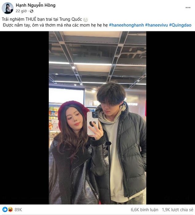 Vlog gây sốt của Hanee chia sẻ trải nghiệm thuê một “em trai” sinh năm 2k6 tại Thanh Đảo với giá 50 tệ/giờ (khoảng 190.000 VNĐ). Dù bản chất là dịch vụ hướng dẫn viên địa phương, nhưng những quyền lợi như được chàng trai cao 1m90 nắm tay, thơm má, xách đồ và đưa đón đã mang đến loạt khoảnh khắc “tình bể bình”. Hình ảnh hot girl Việt rạng rỡ sánh bước bên chàng trai cao lớn giữa phố cảng Thanh Đảo gợi nên một câu chuyện ngôn tình đời thực, khiến nhiều người vừa bối rối vừa ghen tị.