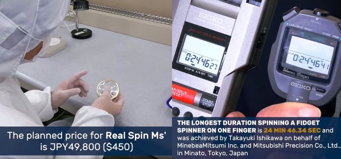 Để chế tạo con quay này, các chuyên gia đã áp dụng công nghệ vệ tinh vũ trụ, tạo ra "Real Spinner Ms". Dự án có sự tham gia của 50 người và tổng chi phí sản xuất là 49.800 yên Nhật, tương đương khoảng 450 đô la.Các nhân viên của MinebeaMitsumi Inc. đã tham gia vào sự kiện thiết lập kỉ lục Guinness thế giới, mỗi người cầm một chiếc spinner và quay một lần. Người có thành tích cao nhất sẽ giành được chiến thắng. Ban tổ chức sử dụng hai đồng hồ điện tử Seiko và hai giám khảo để ghi lại thời gian, sau đó tính kết quả trung bình từ hai đồng hồ này.Người có thành tích quay ngắn nhất cũng đạt hơn 19 phút. Việc giữ thăng bằng cho spinner quay suốt 20 phút đòi hỏi sự tập trung cực kỳ cao và sức chịu đựng. Cuối cùng, thành tích xuất sắc 24 phút 46 giây 34 của Takayuki Ishikawa đã được Guinness công nhận là kỉ lục thế giới.