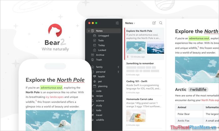 Bear nổi bật như một công cụ hỗ trợ đắc lực cho học sinh, sinh viên trong việc ghi chép và lưu giữ những thông tin học tập quan trọng. Ứng dụng này cho phép bạn thiết lập một shortcut trên màn hình chính để truy cập nhanh chóng khi cần. Dù sở hữu các chức năng cơ bản tương đồng với những ứng dụng cùng loại, Bear được đánh giá cao nhờ khả năng soạn thảo vượt trội và hỗ trợ tạo đến 100 ghi chú riêng biệt trên cùng một thiết bị. Bên cạnh tính năng nhập văn bản, Bear còn cho phép người dùng chèn bảng biểu, video, hình ảnh và đa dạng định dạng nội dung khác vào ghi chú, giúp tối ưu hóa không gian lưu trữ thông tin trên điện thoại.