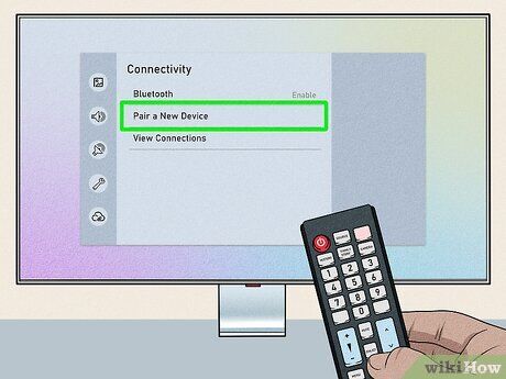Chọn ghép nối với thiết bị mới trên TV của bạn. Trong menu Bluetooth của TV, bạn có thể thấy một tùy chọn như Thêm thiết bị hoặc Ghép nối thiết bị mới. Nếu bạn thấy một trong những tùy chọn này, hãy chọn nó. Nếu TV của bạn không có tùy chọn này và các thiết bị Bluetooth mới xuất hiện trong menu Bluetooth, hãy bỏ qua bước này và tiếp tục với các bước sau.