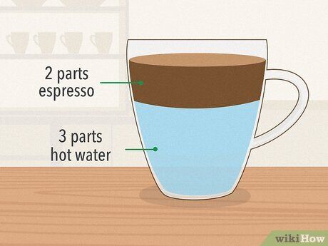 - Tỷ lệ: 2 phần espresso, 3 phần nước