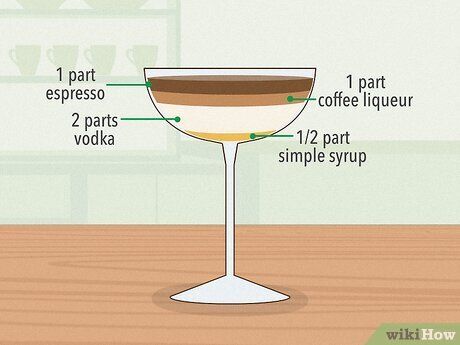 - Tỷ lệ: 2 phần vodka, 1 phần rượu cà phê, 1 phần espresso, 1/2 phần siro đơn giản