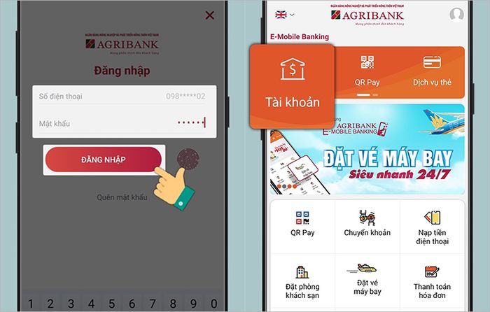Bước 1: Mở ứng dụng Agribank E-Mobile Banking trên điện thoại và đăng nhập vào tài khoản của bạn.
