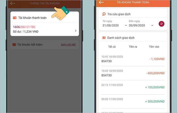 Chọn tài khoản bạn muốn kiểm tra lịch sử giao dịch