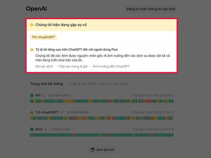 Bạn có thể vào trang kiểm tra tình trạng hệ thống của OpenAI để xem máy chủ có gặp sự cố gì không. Nếu hệ thống đang bảo trì hoặc quá tải, trạng thái sẽ hiển thị màu cam hoặc đỏ kèm theo thông báo chi tiết.